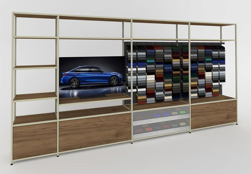 The major perception target is to dedicate the whole showroom to the customer. Thus the Customer Consultation Stages are the most important platforms to connect the brands, products and customers at eye-level. The shelving system is an option to make the various areas more lively, cozy and exclusive.