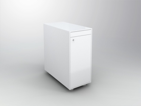 Container, CPU container right, body with solid surface white, organized with material drawers and 1 revolving door, including six power strip, 1 fan, front solid surface white, rear front white painted steel sheet, the revolving door is lockable and with handleless Tip-On.