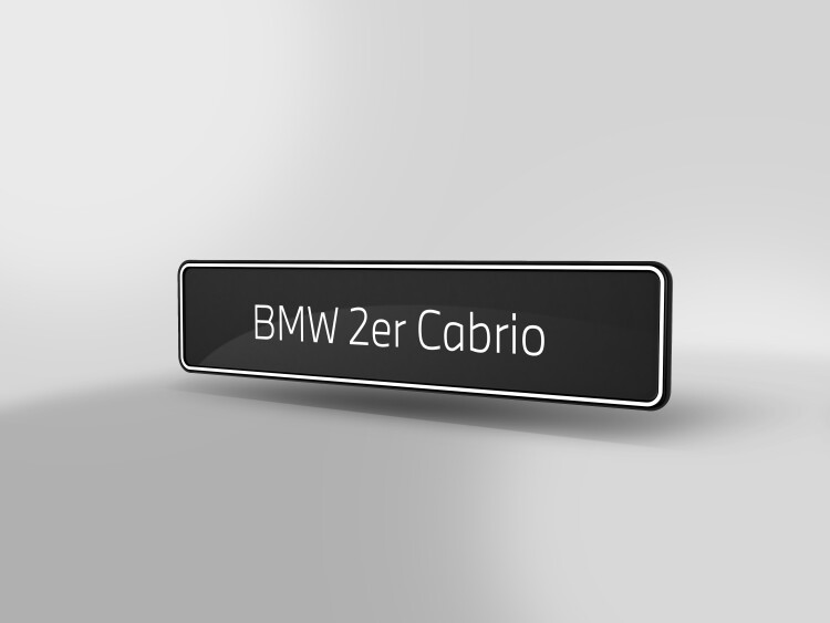 The number plate consists of a black polystyrene plate, which is thermoformed to give it an outer edge (relief, 2 mm offset upwards).