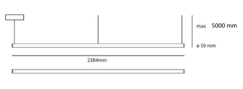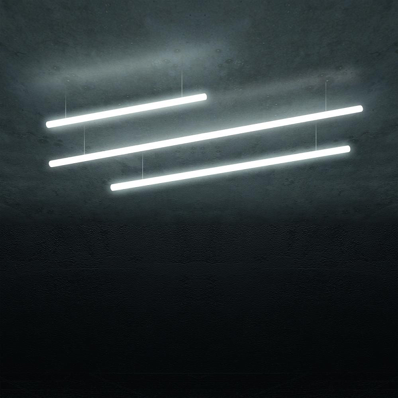 The linear elements are designed in different lengths and are attached to the ceiling by means of wire pendants.