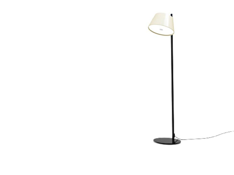 Tam Tam P floor lamp with stem and base in black lacquered metal (RAL 9011) and shade in off-white lacquered aluminium (RAL 1013). Diffuser in methacrylate. 2 m cable with euro-plug (type C). Socket for bulb E27.