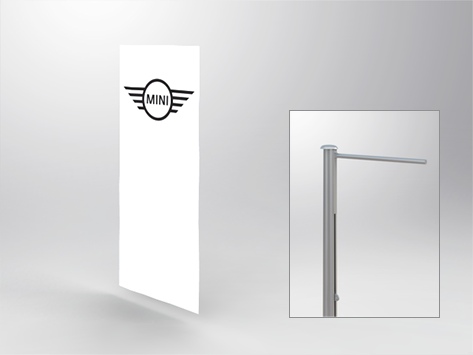 Flag for flagpole with cantilever-arm and plastic hook. Tunnel for max. 40mm Ø cantilever-arm at the top, screen print, Material 100% Polyester.