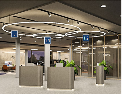 An arrangement of ring lights of various sizes forms a light sculpture that can be used, for example in entrance areas or above a GKL vehicle presentation. This serves as a formal design addition that accentuates the location with a long-range effect.
