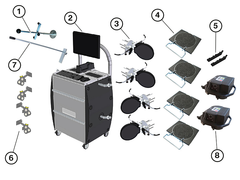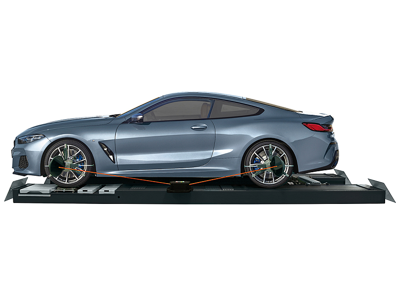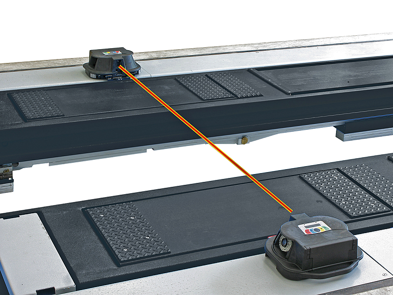 3D wheel alignment equipment with BMW quick action clamp with tracer pins. The tracer pins are positioned in the polycontrol bores of the wheel rim, allowing the vehicle to be measured without wheel rim impact compensation (vehicle roll-in). The use of sensitive measuring technology on the wheel is not required due to 3D reflectors. The data transfer between the pickups on the axis measuring station and the equipment cabinet takes place wirelessly via Bluetooth. In addition, the pickups are supplied via a NiMH battery, which makes a costly cable routing on the wheel alignment station unnecessary. Throughout the measuring process, the ride height is continuously transmitted to the wheel alignment computer. This means the correct nominal data are determined and compared with the actual data at all times according to the ride height.